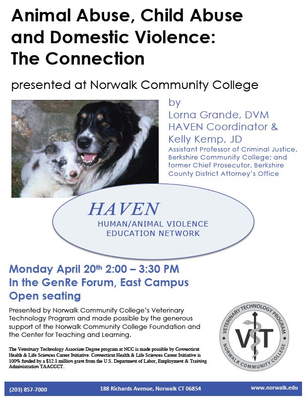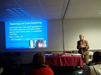 HAVEN partner Kelly Kemp, (Chief Prosecutor: Berkshire County District Attorney's Office) included animal abuse in her lecture about child abuse, elder abuse and domestic violence in her Criminal Law class at Berkshire Community College. The HAVEN educational DVD has been a powerful aid in these types of presentations.